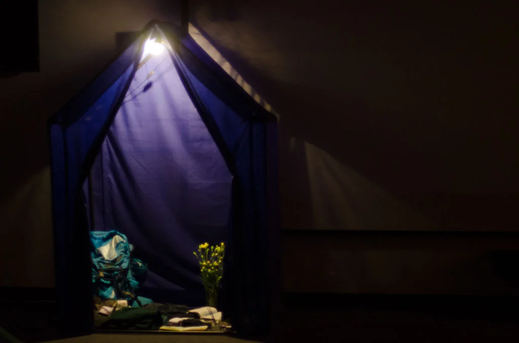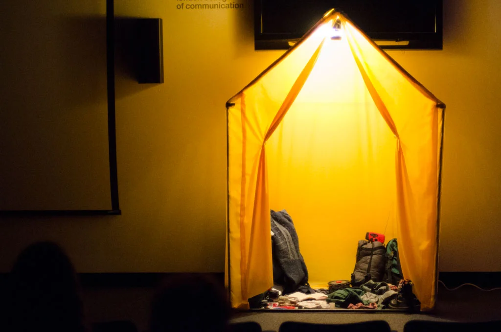 Plodding Along was shown as an interactive installation in a symposium where guests interacted with the tents before finding their seats and were then shown the two films.